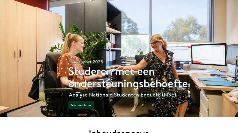 Jaarrapport 2025 Studeren met een ondersteuningsbehoefte Analyse Nationale Studenten Enquête (NSE) Start met lezen Scroll verder Inhoudsopgave Start met lezen 1.2.2 Bijzondere omstandigheden en belemmeringen 1.2.1 Onderwijsinstelling en opleiding 1.2 Studenten die studeren onder bijzondere omstandigheden 1.1 Inleiding 1. Studeren onder bijzondere omstandigheden 2. Openheid over belemmering Start met lezen 2.2.3 Tevredenheid met voorzieningen 2.2.2 Voorzieningen 2.2.1 Gesprek naar aanleiding van de melding 2.2 Melders 2.1 Redenen om niet te melden 2.1 Melden op de onderwijsinstelling Start met lezen 3.2 Toegankelijkheid van het onderwijs 3.1 Begrip en omgang 3. Toegankelijkheid 4. Algemene tevredenheid Start met lezen Start met lezen Colofon Jaarrapport 2025 Studeren met een ondersteuningsbehoefte Start met lezen Analyse Nationale Studenten Enquête (NSE) Scroll verder Start met lezen 1.2.2 Bijzondere omstandigheden en belemmeringen 1.2.1 Waar zij studeren 1.2 Studenten die studeren onder bijzondere omstandigheden 1.1 Inleiding 1. Studeren onder bijzondere omstandigheden Colofon Start met lezen Start met lezen 3.2 Toegankelijkheid van het onderwijs 3.1 Begrip en omgang 3. Toegankelijkheid 4. Algemene tevredenheid Start met lezen 2.2.3 Tevredenheid met voorzieningen 2.2.2 Voorzieningen 2.2.1 Gesprek naar aanleiding van de melding 2.2 Melders 2.1 Melden op de onderwijsinstelling 2. Openheid over belemmering Start met lezen