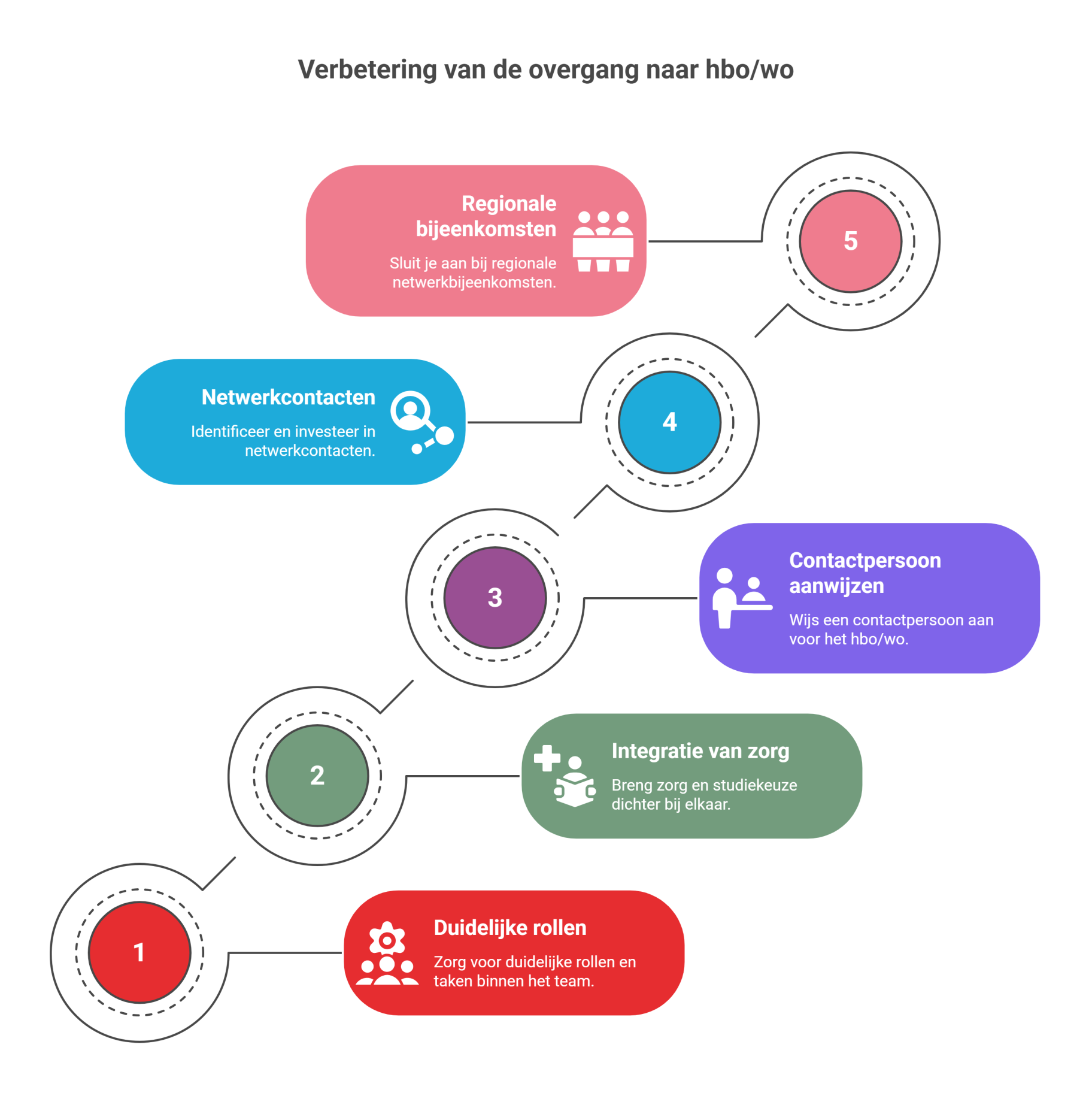 Breng zorg en studiekeuze dichter bij elkaar, omdat deze vaak gescheiden zijn in v(s)o-scholen. Dit helpt bij een soepele overgang naar vervolgonderwijs.