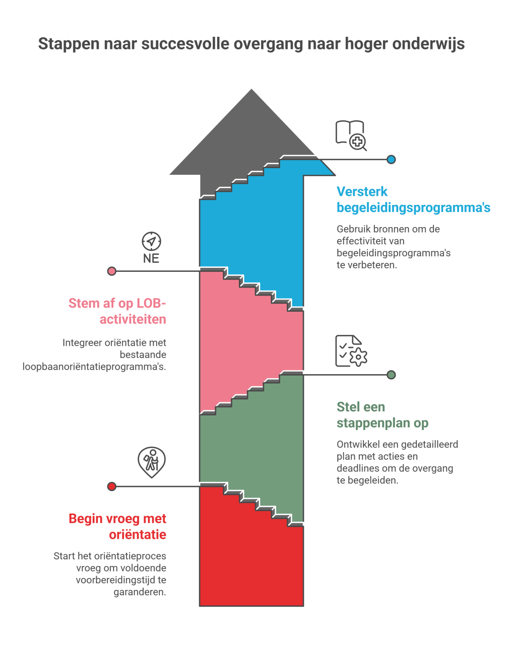 Bij de overgang van v(s)o naar hbo/wo is het belangrijk dat de leerling op tijd begint met oriënteren. Je kunt de leerling helpen door samen een stappenplan op te stellen: wat komt er aan, welke acties moet de leerling ondernemen en wat zijn de deadlines? Deze oriëntatie sluit aan bij de activiteiten binnen loopbaanontwikkeling en -begeleiding (LOB). Bekijk ook de handreiking LOB hbo: Kiezen voor een opleiding en dan…’ voor inspiratie om bestaande begeleidingsprogramma's te versterken.