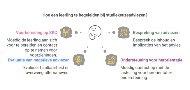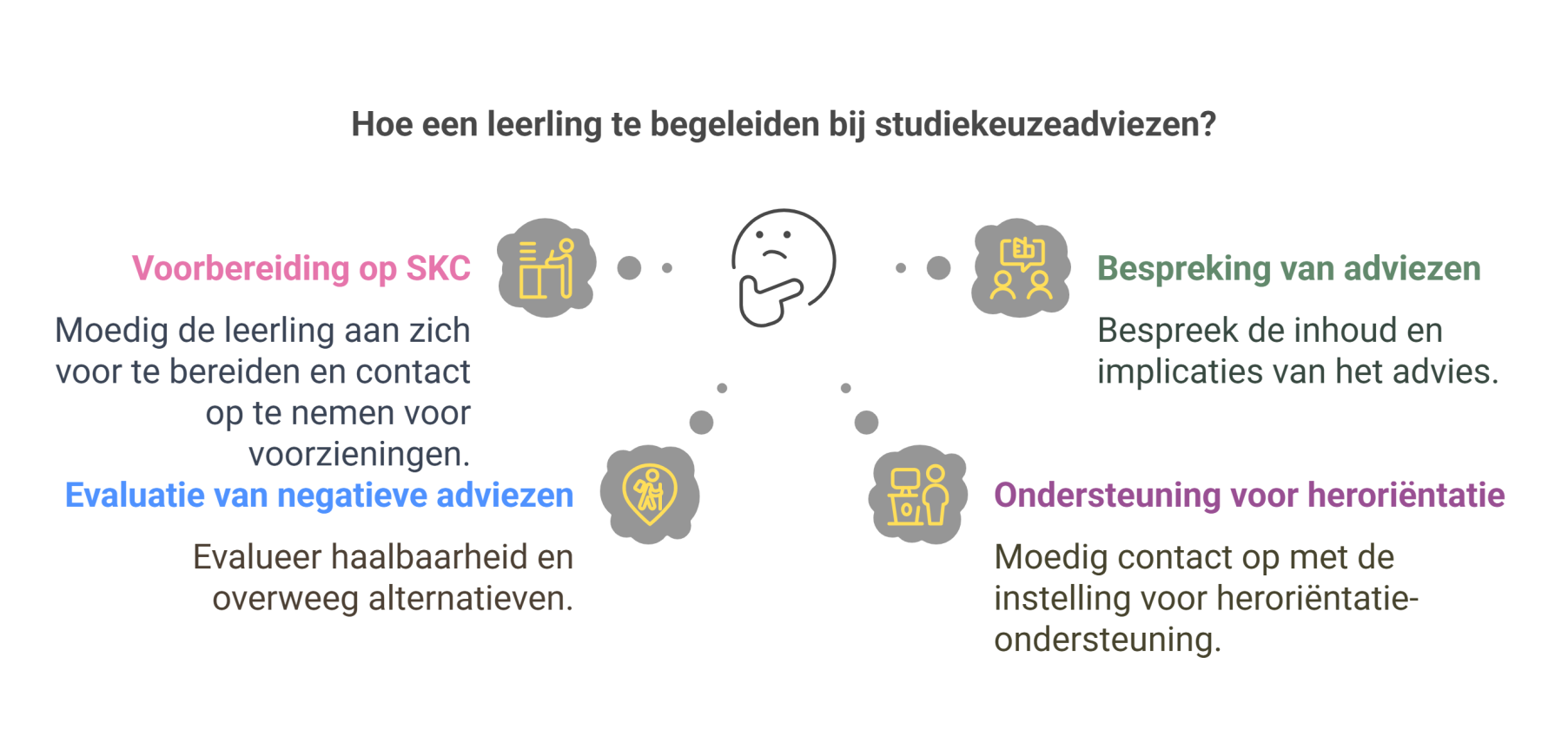 Bij een negatief advies, bespreek met de leerling de argumenten en evalueer of de studie en het beroep haalbaar zijn. Overweeg alternatieve studies of andere onderwijsinstellingen. De leerling beslist zelf of die het advies opvolgt.