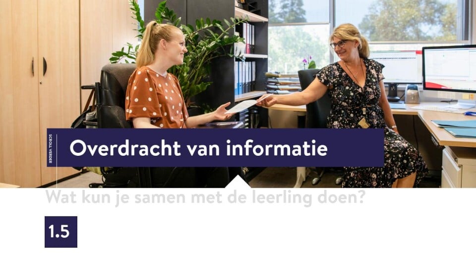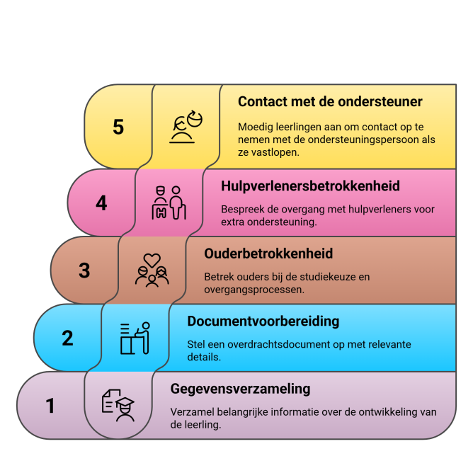 Een doorgaande onderwijsleerlijn is essentieel voor leerlingen met een ondersteuningsbehoefte. De overdracht van informatie over hun ontwikkeling en concrete handelingsadviezen maakt hier onderdeel van uit. De leerling is verantwoordelijk voor het overdragen van gegevens, waarbij maatwerk nodig is. Houd rekening met de Algemene Verordening Gegevensbescherming (AVG).